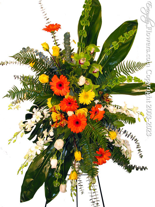 Everyday Flowers has created this funeral flower spray using orange and yellow gerbera daises green cymbidium orchids yellow roses and white dendrobium orchids. Send this funeral arrangement to mortuary and church locations within the Orange County California area with Everyday Flowers.