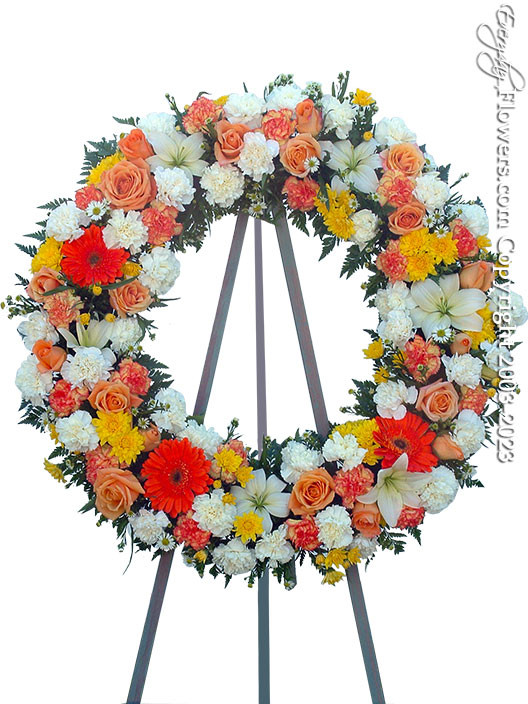 Orange and White sympathy wreath using orange roses white carnations orange daises and white lilies. Measures 24 inches wide and stands on a 56 inch tall easel. Delivery available to all cities located in Orange County California.