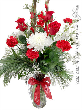 Joyful Christmas is a beautiful arrangement of red roses, gladiolas, red carnations, white china mums, white stock, fresh chrsitmas greens, babies breath, and a printed christmas theme ribbon. This arrangement is perfect for any holiday celebration.