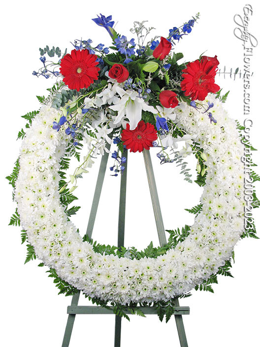A funeral wreath designed with white chrysanthemums measuring 24 inch wide topped off with a spray of red white & blue flowers including gerbera daisies, roses, lilies, iris and delphinium. This funeral wreath is available for delivery to all cities located in Orange County California. Same day delivery is also available to all mortuaries and churches located in our delivery area.