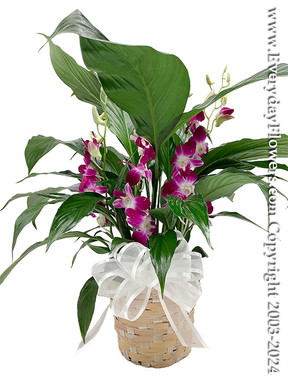 A hearty indoor plant, peace lilies are easy to take care of and do very well indoors. This plant arrives in a 6 inch wixker basket with three stems of cut purple orchids placed into water tubes and inserted into the soil.