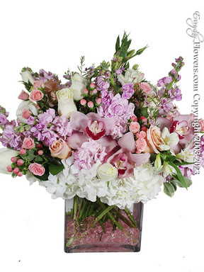 Let us create a stunning bouquet of lush flowers including white hydrangea and light pink spray roses. Local grown pink cymbidium orchids and Pink California Grown Stock. Imported oeachy pink shimmer roses. Pink Hypericum and seasonal wax flowers deisgned in a large 7X7 Glass Cube Vase with pink acrylic gems placed inside of the vase.