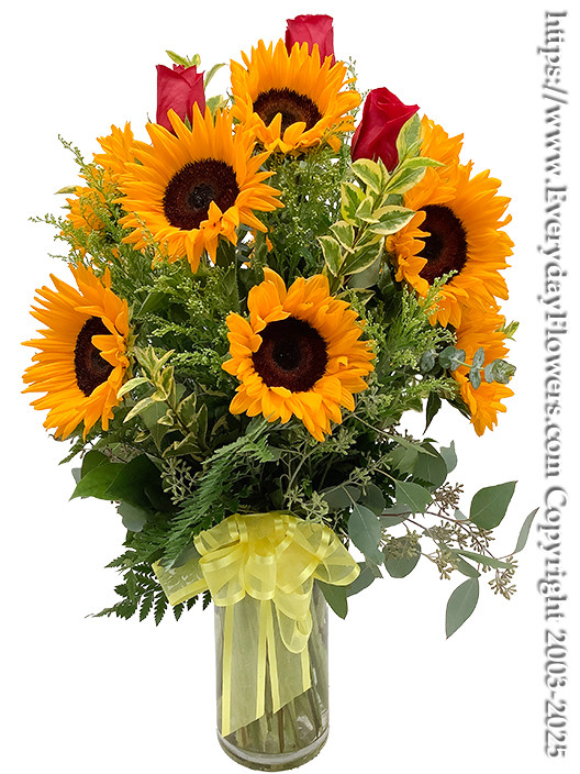 A dozen yellow sunflowers arranged iwth three long stem red roses placed in a tall glass vase.