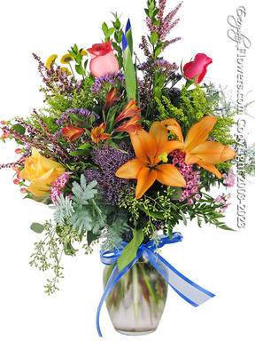 Our garden style arrangements are designed to be tall & airy with a focus on certain larger flower types such as lilies and long stem roses. This arrangement starts with bright orange asitiac lilies (Non Frgrancance) with acents of yellow red & pink long stem roses deep blue iris and purple carnations with yellow & orange alstromeria. Using seasonally available filler flowers including queen annes lace, solidaster, wax flower, sea foam statuce arranged in a glass vase with a hand tied silk blue ribbon.