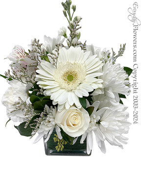 White flowers placed into a cube glass vase. Including white gerbera daisy, white rose, white carnations, white stock, white alstroemeria, queen annes lace and seasonal filler. Upgrades include larger vases.