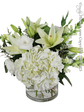 A bouquet of white flowers including white hydrangea with white lilies snap dragons lisianthus and misty. Arranged in a cylinder glass vase.